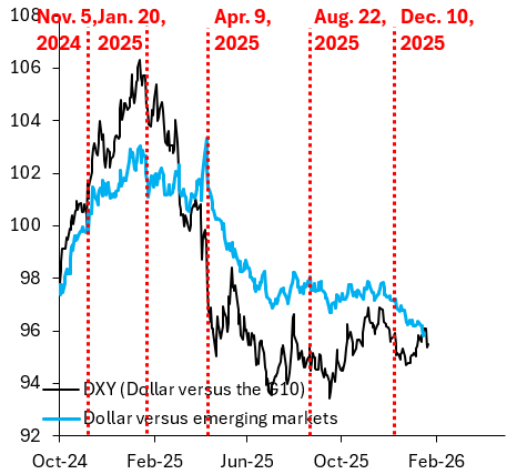 In my preview for markets in 2026, I forecast that the Dollar would resume its fall this year after it went into a holding pattern in the second half of 2025. My rationale was that the Dollar versus emerging markets (EM) has proven itself to be the most reliable leading indicator of Dollar direction. This measure has been falling ever since the Fed cut rates on December 10, a sign Dollar weakness is about to assert itself again. This post provides a quick update on Dollar price action.