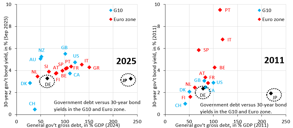 The cumulative impact of all this is no doubt massive and artificially suppresses long-term yields of high debt countries. But how to quantify the counterfactual of where yield would be without all this? The left chart above is the one I used two days ago to show how absurdly low Japan’s 30-year yield is. The right chart is exactly the same, only that it gives 30-year yields and debt levels in 2011, i.e. before Draghi’s “whatever it takes” speech. Debt levels for Italy (IT) and Spain (SP) were quite a bit lower, but their yields were substantially higher, a sign that markets were actively pricing sovereign risk premia. Yields for safe haven countries like Germany (DE) were lower, which points to an important - but often overlooked - flipside to yield caps for high-debt countries: yield caps reduce the safe haven appeal of low debt countries, because ECB removes the left tail from the distribution. The bottom line is that the cumulative effect of over a decade of ECB actions is to artificially push up German yields and hold down substantially Italian and Spanish yields.