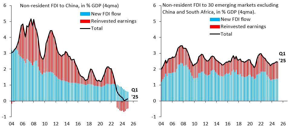 FDI into China is on a declining trend, in contrast to FDI to the rest of EM