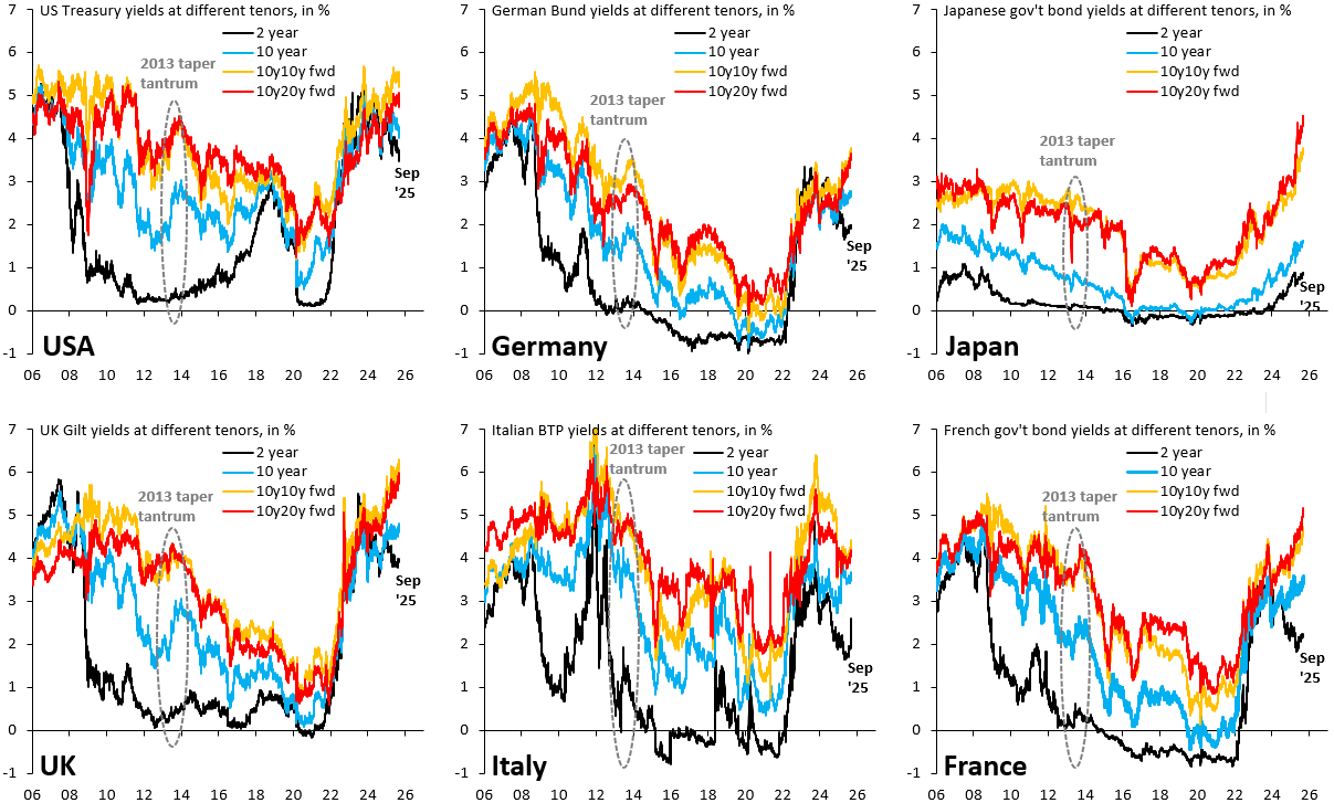 The six charts above replicate what I did for the US (top left) for Germany (top middle), Japan (top right), the UK (bottom left), Italy (bottom middle) and France (bottom right). Each chart shows the 2-year government bond yield (black), the 10-year government bond yield (blue) and then also 10y10y (orange) and 10y20y (red) forward yields, which I back out from 10-, 20- and 30-year yields. The appeal of the latter two metrics is that they strip out what’s going on with very short-term yields, which are currently getting pulled down by mounting expectations of US recession. The 10y10y forward yield is what markets price for the 10-year yield in 10 years’ time, while the 10y20y forward is the 10-year yield in 20 years’ time. There should be much less noise in either measure from short-term cyclical fluctuations.