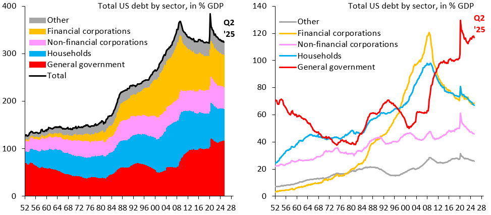 One of the more puzzling things about 2025 is that long-term US Treasury yields have fallen despite a fiscal picture that’s out of control and erratic leadership. Markets are debating three possible explanations for this. First, while public debt is rising fast, the rest of the economy is deleveraging, so that overall indebtedness is pretty stable. Some people think this is what’s holding down Treasury yields. Second, increasingly dovish expectations for the Fed are pulling down front-end yields, which also pulls down the long end of the yield curve. That’s consistent with the 10-year yield falling sharply in August and September after the dovish Jackson Hole meeting. Third, even if the US has many problems, the challenges facing other countries are worse. As a result, US Treasuries have been getting safe haven inflows, especially as traditional safe havens like Japan and Germany are falling by the wayside. Today’s post reviews each of these. My money’s on the last explanation. The US is still the best of a bad bunch.
