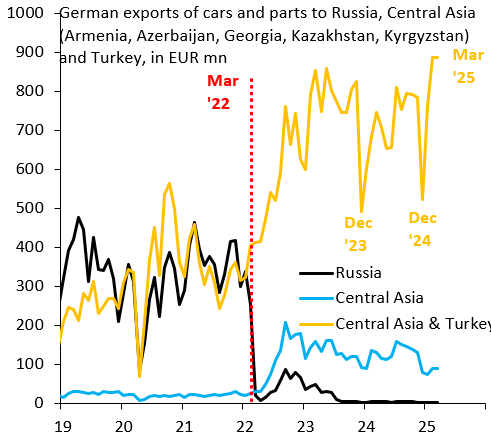 The chart shows that Germany’s exports of cars and parts to Russia collapsed after Russia’s invasion of Ukraine. However, the drop in exports is more than fully offset by a sharp rise in exports to third countries, especially once you include Turkey (orange line). The fact that exports to these third countries rise right after the invasion rules out that this is about domestic demand in these places. Instead, this is about German cars going to Russian buyers.