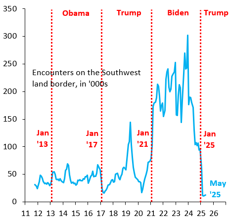 The US yesterday published data for “encounters” on the Southwest land border for May 2025. Encounters include apprehensions at the border, including of people who are deemed inadmissible, and expulsions to the country of last transit (usually Mexico) or the home country. These data are a good proxy for unauthorized immigration at the national level, for which data only start in 2019. The chart shows monthly encounters back to 2011. It marks the start of every new administration back to President Obama.
