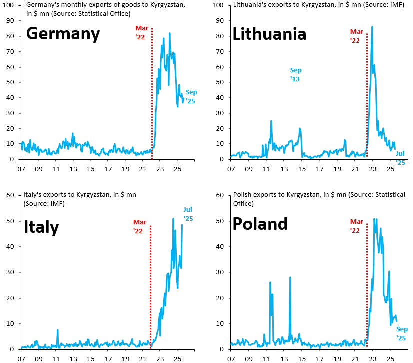 The charts above show exports to Kyrgyzstan from Germany (top left), Lithuania (top right), Italy (bottom left) and Poland (bottom right). Lithuania and Poland ended these transshipments, which shows it’s entirely possible to do so (it basically takes a phone call to key exporters) and is therefore - above all - a question of political will. It’s this political will that Russia and China are watching. As long as that is lacking, the EU is banging its head against the wall in its quest to become a feared global player.