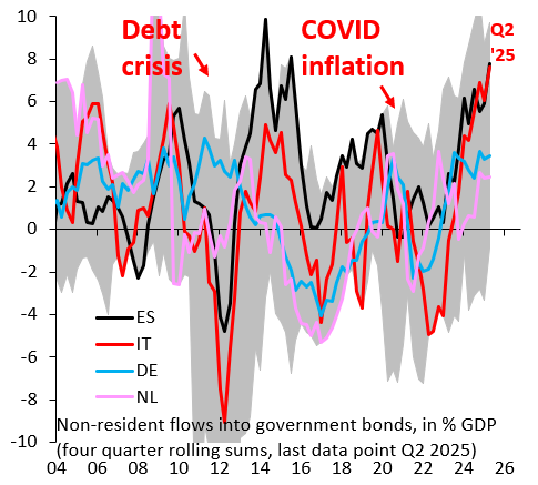 Several points are worth making. First, the US deficit is bad, but - in this international perspective - the US occupies a middle ground. Finland (FI), Canada (CA), the UK (GB) and France (FR) are worse. Second, not everyone is running big deficits. Australia (AU) is basically in balance and the Netherlands (NL) runs a very small deficit. Third, Italy (IT) and Spain (ES) are seeing exceptionally strong foreign buying reflecting things the ECB did in 2022 to cap both countries’ yields, including large bond purchases and the introduction of the TPI anti-fragmentation tool. These inflows are therefore artificial. Markets are simply following the lead of the ECB, which - through its past actions - has created an expectation that it backstops these countries in bad shocks.