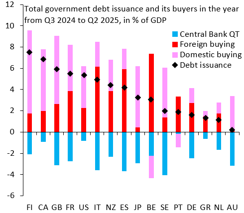 The chart above looks at debt issuance and how it’s being financed across 16 advanced economies. The black diamonds show net new debt issuance - what you can basically think of as the budget deficit - from Q3 2024 to Q2 2025 in percent of GDP, where I’ve sorted countries in descending order. The red bars show the extent of foreign buying, the blue bars show quantitative tightening (QT) by central banks, i.e. the reduction in their holdings of government debt, and the pink bars show other domestic buying, a residual category that includes domestic banks and any other domestic buyer. All of these sources of demand are also in percent of GDP over the same period.
