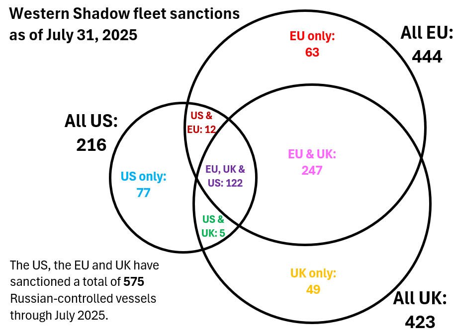 We’ve done lots of work at Brookings to show that sanctions on the shadow fleet are highly effective. Ben Harris, Liam Marshall and I recently published a report showing that US sanctions are especially effective at shutting down shadow fleet activity. EU and UK sanctions also pack a punch, but work best when they’re done jointly with the US. The recent wave of EU and UK sanctions are a big window of opportunity for the Trump administration now. As the Venn diagram above shows, there’s 359 ships that are sanctioned by the EU and/or UK that aren’t currently sanctioned by the US. The single most effective thing the US can do to hurt Russia is to sanction these vessels as well. US sanctions carry extra punch because the fear of secondary sanctions is far greater than for the EU and UK. Doing this would add to the already considerable damage to Russia from Western sanctions and would certainly get Putin’s attention.