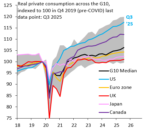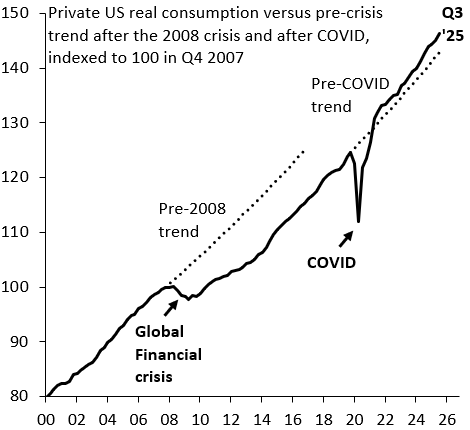 Dollar weakness: the Dollar rose massively in the decade before the COVID pandemic, powered by US outperformance vis-à-vis its G10 peers. US growth is still outperforming everyone else - the chart below shows GDP rising above its pre-COVID trend - but what’s different now is that the Fed is easing into this boom. That’s toxic for the Dollar, because it means that nominal (and real) rates will fall relative to the rest of the world. That’s not to say that other US assets will do badly. Low real interest rates are good for the stock market and I fully expect the S&P 500 to do well. Financial conditions will be extremely loose, which may of course be the plan into the midterm elections later this year.