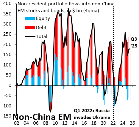 Emerging markets gain: the distinction between advanced economies and EM has always rested on the quality of institutions and that is very obviously eroding. That isn’t exclusively a US issue. The ECB - as I discuss above - is increasingly under the influence of high debt countries, which is really just fiscal dominance. The Bank of Japan remains a large gross buyer of Japanese government debt, without which yields would be much higher and Japan would be in a debt crisis. There’s all kinds of erosion of institutional quality and data across the G10, which blurs the dividing line between the G10 and EM. That’s fundamentally positive for EM, which is why - as the chart below shows - capital flows to non-China EM have been so incredibly strong.