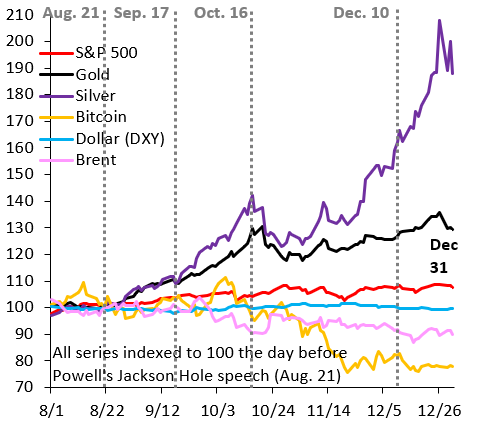 The debasement trade roars ahead: this trade was the defining feature of 2025 and reflects fear that unsustainable debt burdens across many advanced economies will be inflated away. The debasement trade is about the search for safe havens from this debt monetization and doesn’t just include precious metals but also the currencies of any and all low debt countries. There’s obviously going to be many ups and downs to this trade. The underlying driver is the fear that retirement savings will be inflated away, which makes the debasement trade prone to bubbles. But my basic view is that this thing has only just gotten started, after - as the chart below shows - already totally crazy gains in 2025.