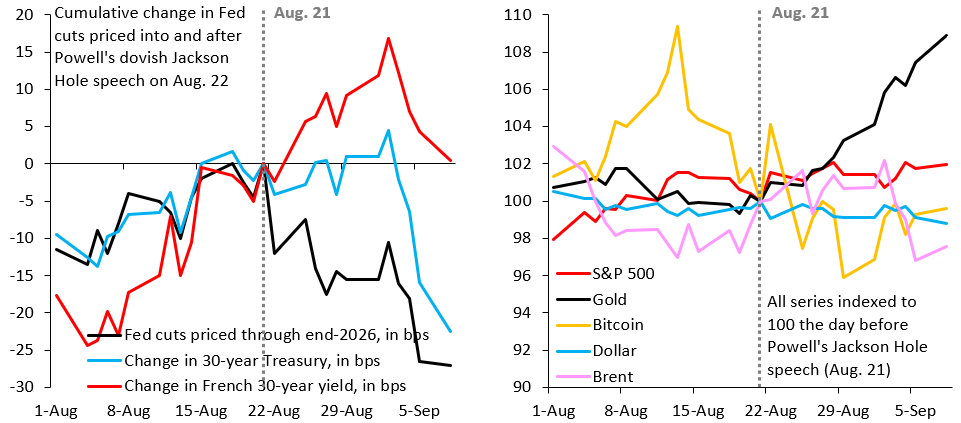 The two charts above show what’s been going on. The left chart shows the cumulative change in market pricing for Fed cuts (black line) through 2026 into and after August 21 (the day before Powell’s speech). The chart also shows the cumulative change in the 30-year Treasury yield (blue line) around August 21 and the cumulative change in the French 30-year yield (red line). Markets immediately priced more Fed easing after Powell’s speech, but that didn’t pull down the 30-year Treasury yield until weak payrolls this past Friday (Sep 5). The fact that the 30-year Treasury yield didn’t fall immediately is weird and worrying. It took very weak payrolls to finally do that.