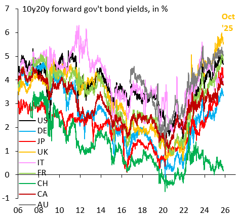 Longer-term bond yields have stabilized: the chart below shows the massive trend-rise in longer-term government bond yields across advanced economies, but this rise has come in fits and starts, as periodic reminders of dysfunctional fiscal policy hit markets. We’re currently in another one of these pauses. After all, fiscal policy remains out of control in much of the G10. Nothing’s changed.