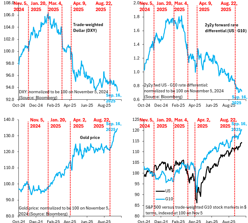 The Dollar weakened sharply yesterday, falling below its previous low of July 2 (top left chart). Yesterday’s fall likely reflects markets positioning for a bigger-than-expected 50 basis point cut, but - as the top right chart shows - this fall was really a catch-up to the 2y2y forward rate differential of the US versus the rest of the G10, which fell sharply after Chair Powell’s very dovish Jackson Hole speech on August 22. That speech sparked a remarkable rally in gold (bottom left chart) and - with a lag - has also powered the S&P 500 higher (bottom right chart, black line), even as signs mount that the labor market is slowing significantly.