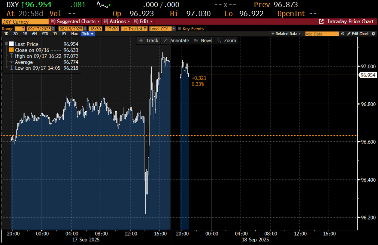 In my time on the Goldman trading floor, I learned that Fed meetings are very difficult to trade. That’s because there are two distinct and sometimes opposing signals. The first comes at 2 pm when the policy statement and economic projections are released. This signal was unambiguously dovish yesterday, because the median dot showed a total of three cuts in 2025, up from only two at the June meeting. But then everything changed with the start of the press conference. At 2:41 pm, Chair Powell said “there wasn’t widespread support for a 50 basis point cut today,” a comment that was followed at 2:42 pm by “you can think of today’s move as a risk management cut.” Then came “Fed is in a meeting-by-meeting situation” at 2:50 pm and “Situation of two-sided risk means no risk-free path” at 2:52 pm. All this was way more complicated than what the market wanted to hear. As the chart above shows, after its initial fall, the Dollar ended the day stronger.