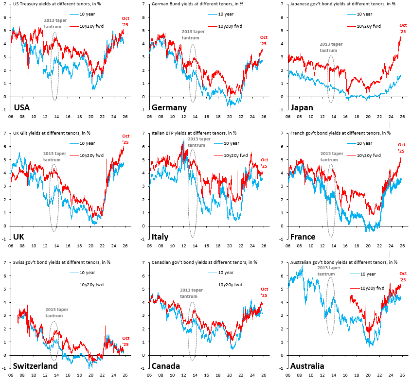 I last showed this panel of charts in a post I wrote almost a month ago. Each chart shows the 10-year government bond yield in blue and the 10y20y forward yield in red. The latter is what markets price for the 10-year yield 20 years from now, which I back out from 20- and 30-year government bond yields. Longer-term yields have risen in dramatic fashion everywhere, which means markets are demanding higher and higher risk premia to hold long-term debt. This spike in yields is the flip side to the dramatic - and worrying - rise in gold prices that’s been playing out this year. It’s clear markets are in a desperate search for safety from debt monetization and currency debasement.