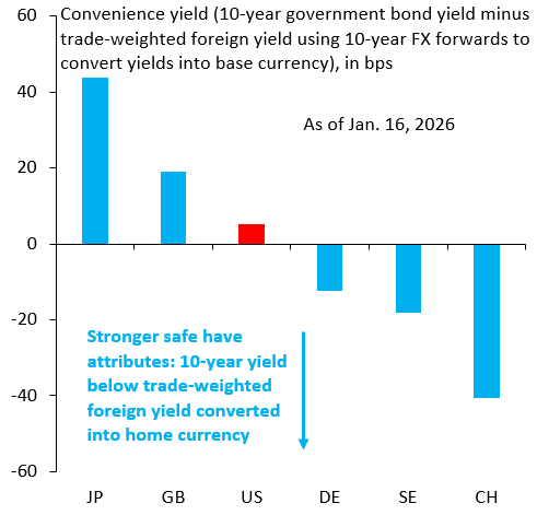 The second reason is that the US doesn’t actually look that great in a cross-country comparison. The chart above shows the 10-year convenience yield across countries, based on data from the end of last week. The US might be better than Japan or the UK, but it’s far behind Switzerland or Sweden, which markets are trading as the ultimate safe havens these days. The US exorbitant privilege has many blemishes.