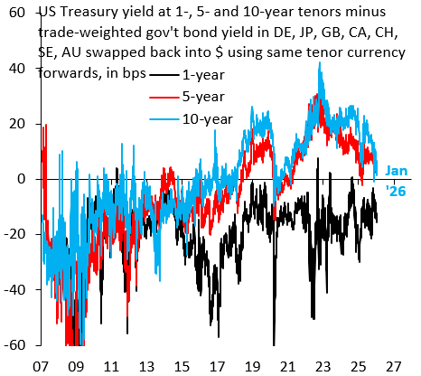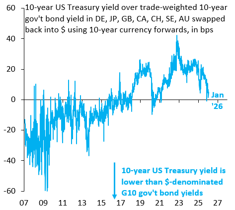The chart above shows the premium of the 10-year US Treasury yield over the trade-weighted average for 10-year government bonds in Germany (DE), Japan (JP), Canada (CA), Switzerland (CH), Sweden (SE) and Australia (AU) after those yields are swapped back into Dollars using 10-year FX forwards. In the past, especially around the global financial crisis, the US enjoyed lower interest rates than its peers, which some link to greater liquidity and safety of US Treasuries. However, this “convenience yield” decayed over time, presumably as fiscal policy got more and more out of control. In the run-up to Trump 2.0, US interest rates were consistently above foreign ones, so the US was paying a risk premium. Counterintuitively, this premium faded in the course of 2025 and is currently near zero, the first time since COVID this has been the case.