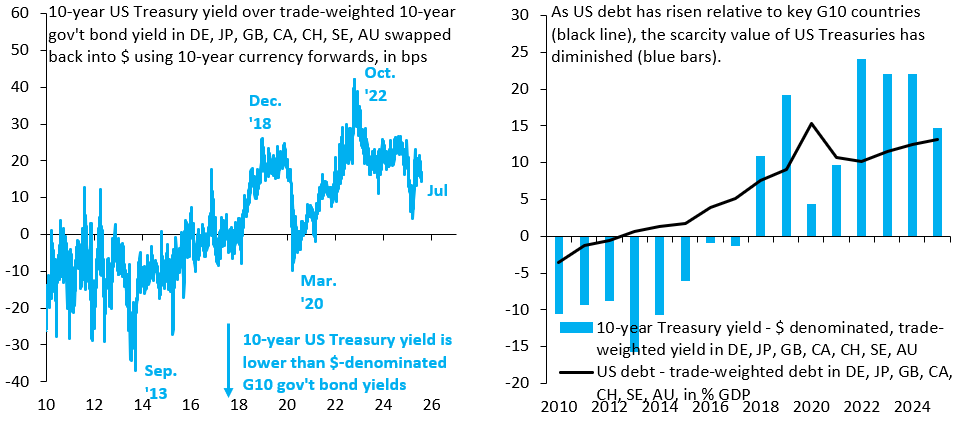 The left chart shows a daily time series for this 10-year Dollar differential, starting in January 2010 and going through July 2025. It’s clear that the “convenience yield” on US government debt has disappeared. Where it used to be that the 10-year yield was on average around 10 bps below Dollar-denominated yields in the rest of the G10, there’s now a 20 bps premium. The exorbitant privilege looks like it’s gone.