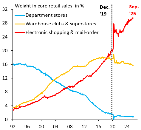 Before the pandemic, there was a time when there was intense interest in the “retail apocalypse,” the shift to online buying that was driving many brick and mortar retailers out of business. It’s ironic that interest in this topic has faded, because COVID was an absolute body blow to brick and mortar retail. The pandemic forced many households, which had previously resisted the shift to online buying, to switch to the internet and they’ve never gone back. Department stores like Macy’s, Nordstrom or Kohl’s have ceased being economically meaningful entities in US retail.