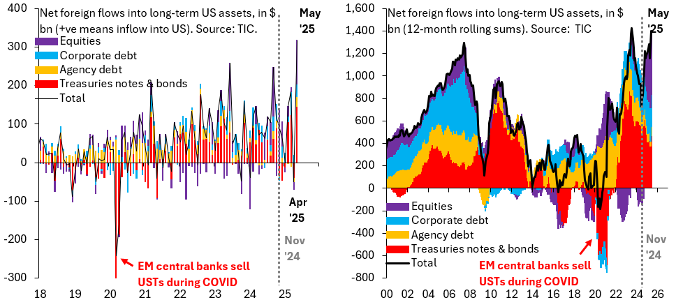 The two charts above show the same data, which are published by the US Treasury six weeks after the end of every month and cover net foreign inflows into long-term US assets, spanning flows into US equities (purple), corporate debt (blue), Agency debt (orange) and Treasury notes and bonds (red). The left chart focuses on more recent data, giving monthly flows from January 2018 through May 2025 in billions of Dollars. The right chart gives a longer-term perspective, showing 12-month rolling sums of these flows from January 2000 through May 2025.