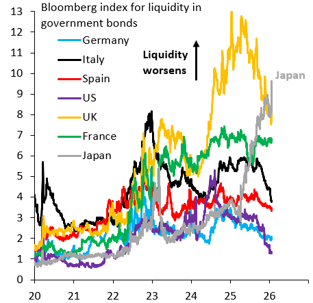 The chart above shows Bloomberg’s bond market liquidity index for a selection of advanced countries. Let’s be clear about what this thing is first of all. Ideally, the yield curve is perfectly smooth as you go from short to longer maturities. In practice, it can happen that the yield on adjacent maturities is very different, which - intuitively - is a decent signal that bond market liquidity is poor. The Bloomberg liquidity index sums up the absolute value of these kinks in the yield curve, so that a higher value may be a signal that liquidity is poor. This in no way is a perfect signal. It’s given false positives on a number of occasions, most notably for the US in 2024. But - overall - I think this is a useful measure and I look at it regularly.