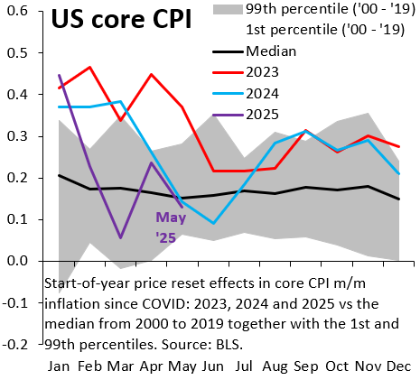The chart shows what a big deal this residual seasonality has been since COVID. The black line is the historical median for seasonally adjusted month-over-month core CPI inflation from 2000 - 2019, i.e. in the two decades before COVID. As you’d expect for seasonally adjusted data, this line is essentially flat through the calendar year. The chart also shows monthly inflation readings for 2023 (red line), 2024 (blue line) and so far in 2025 (purple). Residual seasonality is pushing up inflation readings in the first quarter, followed by lower inflation readings in the middle of the year. We’re currently in that inflation “lull,” which is temporarily holding down inflation. This effect will fade as we move into the second half of 2025.