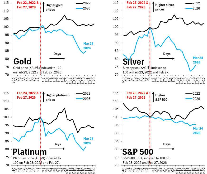 The four charts above show price action in gold (top left), silver (top right), platinum (bottom left) and the S&P 500 (bottom right) since the start of hostilities in the Gulf. I compare current price action to what happened after Russia’s invasion of Ukraine in 2022, to give historical perspective in a similar kind of shock. A couple of points are worth making. First, all precious metals are down since the outbreak of war. Gold is down 15 percent, silver is down 25 percent and platinum is down 20 percent. To put this in perspective, the S&P 500 is down five percent over the same period. Precious metals have thus clearly underperformed. Second, a fall in the S&P 500 of five percent hardly qualifies as a big risk-off, which means that the safe haven status of gold won’t have been triggered. That makes me inclined to think recent declines are a vestige of the huge run up in precious metals prices and positioning. Third, Russia’s invasion of Ukraine didn’t really trigger much of a rally in gold or other precious metals and the S&P 500 - on a similar time scale - is almost identical to now. That again leans in the direction of this being a positioning purge.