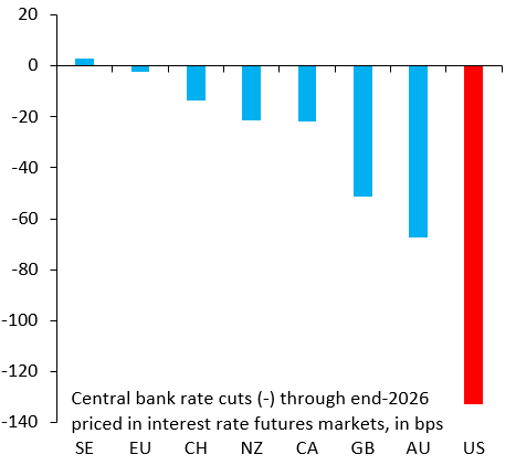 The chart above shows what’s going on. It uses interest rate futures to calculate how much markets expect key central banks to cut their policy rates through the end of next year. As of Friday, markets priced 130 basis points in cuts for the Fed (so slightly more than five 25 basis point cuts) in contrast to an ECB that’s expected to be on hold. Only the Bank of England (GB) and Reserve Bank of Australia (AU) come close in the eyes of the market, with 50 and 70 basis points priced, respectively.