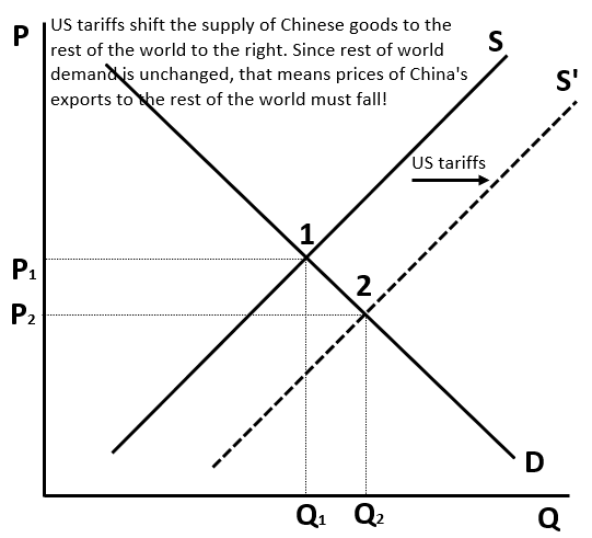 The simple chart above shows what’s going on. If China is redirecting goods that would have gone to the US to the rest of the world, this equates to a shift down and to the right of the supply curve. The rest of the world didn’t ask for this rise in supply, so China has to cut the price of its exports to generate demand. This is a move down the demand curve, which means falling prices, and could explain why exports to the rest of the world have risen.